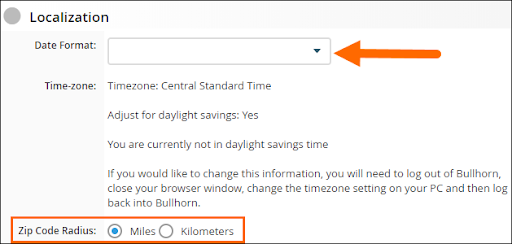 Your date/time format and radius format options are found under Localisation. You can choose your date/time format from the dropdown menu and toggle the radius between miles and kilometers.