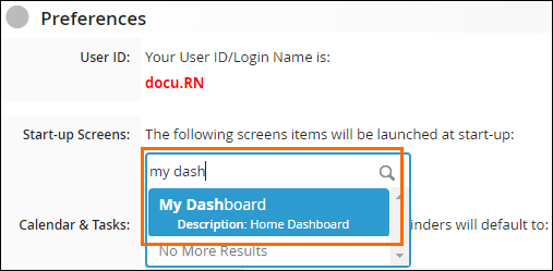 Start-up Screens are near the top of the page. To add a start-up screen, click into the field, begin typing the name of the screen, then click on the screen name when it appears.