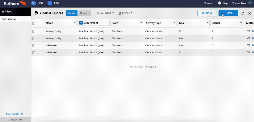 Normally, I tell clients about how they can use the Notes Activity Report within Bullhorn to run SMS metrics for their team. But, in that conversation, something clicked. I realised that our clients could use the Goals and Quotas module in Bullhorn and track progress towards SMS goals automatically, just like they would track other outreach analytics within the ATS.