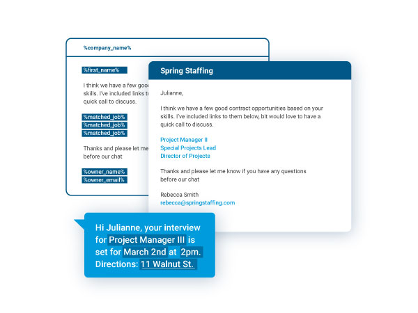The system automatically tracks all email activity associated with a particular candidate record and updates that record in real time, offering a complete view of your candidate interactions and relationships.