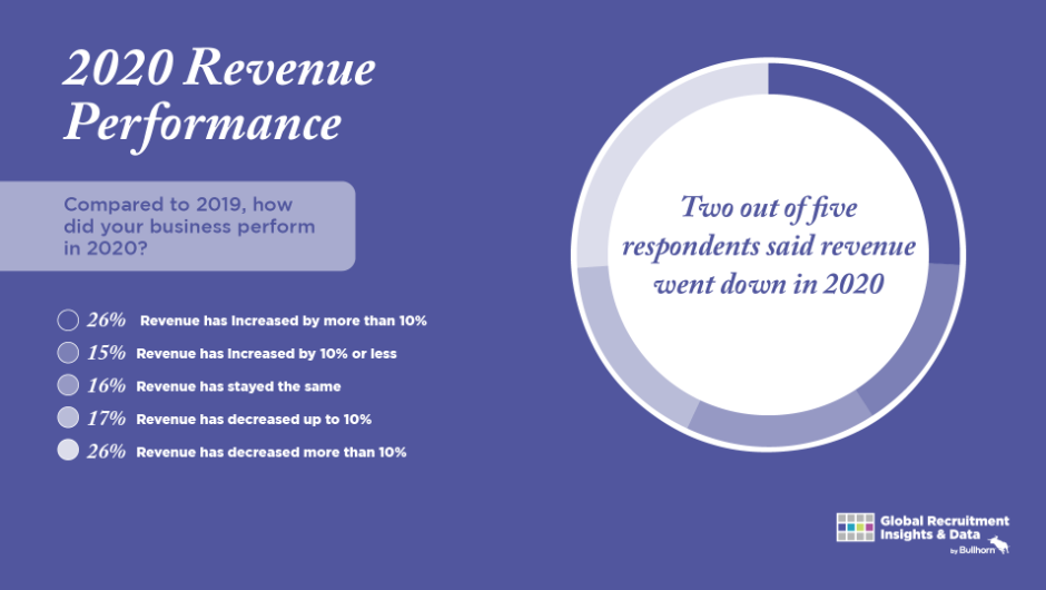 - Respondents who reported a down year in 2020 were 1.5 times more likely to cite winning new business as a priority than their counterparts who reported an increase in revenue. The UK is the only region with respondents that placed winning new business as their top priority overall, ahead of candidate acquisition. UK respondents were also the most likely to report a decrease in revenue in 2020.
