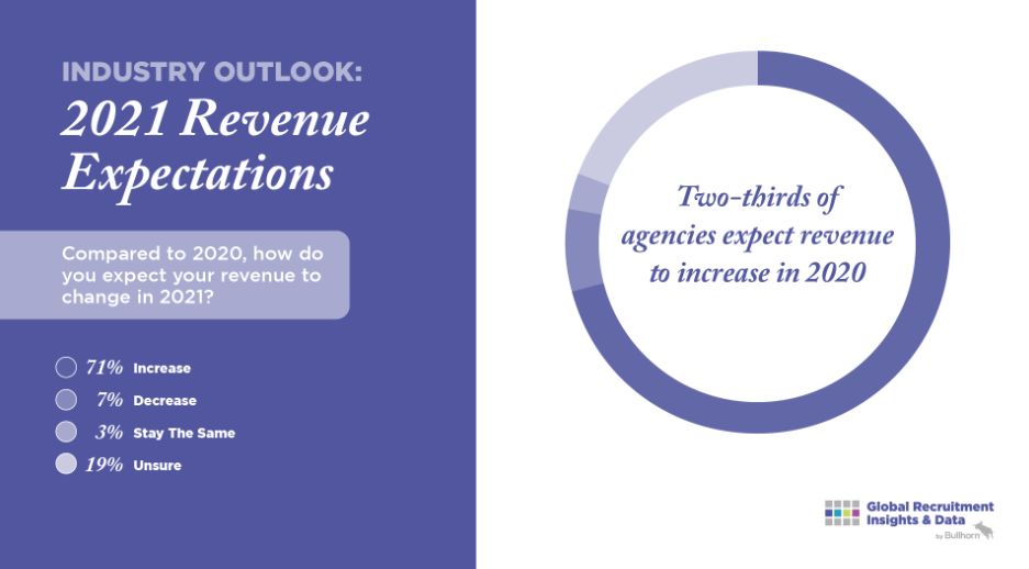 2020 was a challenging roller-coaster year for recruitment firms (and the world). Going into 2020, 71 percent of firms expected revenue to increase over the last year. However, due to the enormous impact of COVID-19, by June of 2020, two-thirds of firms reported their revenue had decreased from the year ahead. Businesses then saw an uptick in demand and performance in the second half of 2020, with only(!) 43 percent of firms reporting a decrease in revenue for 2020 by the year’s end and an equal number reporting an increase in revenue.