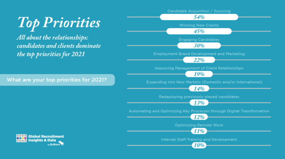 - Candidate acquisition is again the top priority for recruitment firms in 2021. This is perhaps related to the continued existence of the talent shortage (55% say there’s still a talent shortage) despite high unemployment rates.