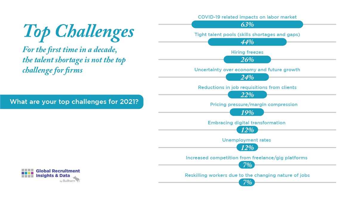 - Respondents cited the unemployment rate as the largest impact of COVID-19 on the industry in 2021. Additionally, 63 percent of respondents cited COVID-19’s effects on the labour market as a top challenge for 2021, making it the top challenge overall. However, the majority (55%) still believe there is a talent shortage, and 44 percent said it was a top challenge for the year. Recruitment professionals cited hiring freezes as the top obstacle to winning new customers.