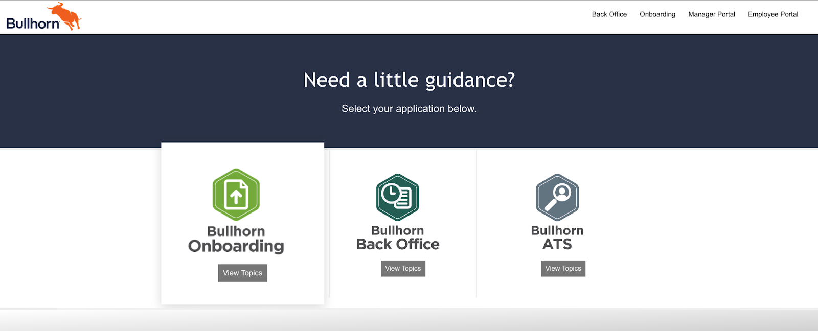 The knowledge base for Back Office and Onboarding has been updated to feature a new look and feel! You can access the new knowledge base via the Help button within Bullhorn Onboarding, or by searching for Onboarding on the Bullhorn Help page.