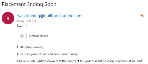 Notice the email address this email came from. Mass mailings should come from the email address you use for Bullhorn. So why does this one have a domain of @bulhornstaffing.com? And why on earth does it include $first name$ and $title$ in the email body?