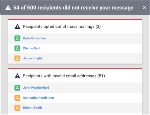 It’s simple: If you don’t receive an error, then your message sent correctly. However, if any recipients have opted-out of notifications or have invalid email addresses in your database, Bullhorn will notify you after you send your email.