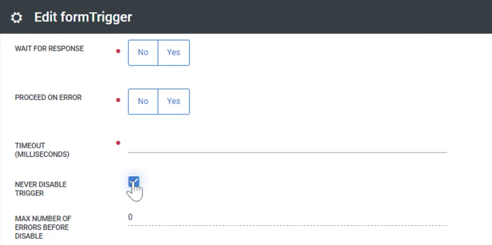 • REST Trigger Proceed on Error Check: Admins will now be able to control whether REST triggers are disabled upon error and the number of errors before being disabled.