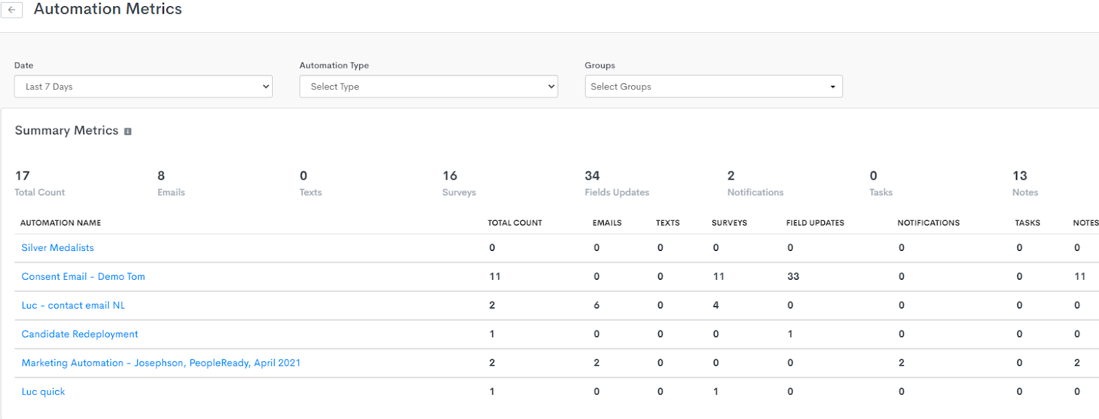• New Automation Metrics Reporting: You can now view important metrics about your Herefish by Bullhorn automations in a summary view, including emails, texts, surveys, field updates, notifications, tasks, and notes.