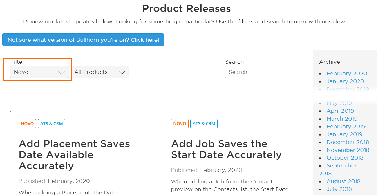One of the easiest and most sure-fire ways to ensure you’re staying up to date with Bullhorn product updates and enhancements is through our release notes page. Here, you’ll see cards for each of our updates, tagged with the product to which it relates. You can even filter for your specific product or ATS version (Novo or S Release) to eliminate updates that aren’t relevant to your product and company.