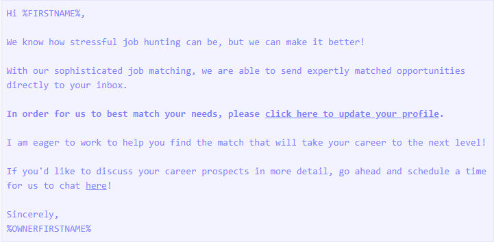 2. Build yourinformation request surveyandemail/text templates. This can include a simple message stating how in order to better serve the candidate’s career and job placement needs, you need to update their resume/location/specialty/etc.