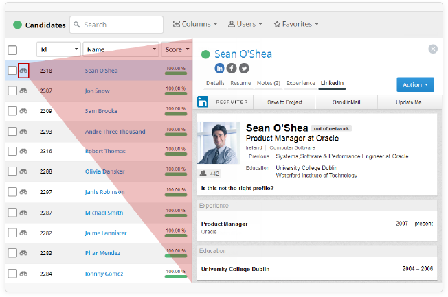 Bullhorn offers a recruitment-specific applicant tracking system integration with LinkedIn Recruiter to streamline a recruiter’s workflow, reduce clicks, and provide a continuously up-to-date view of candidate information.