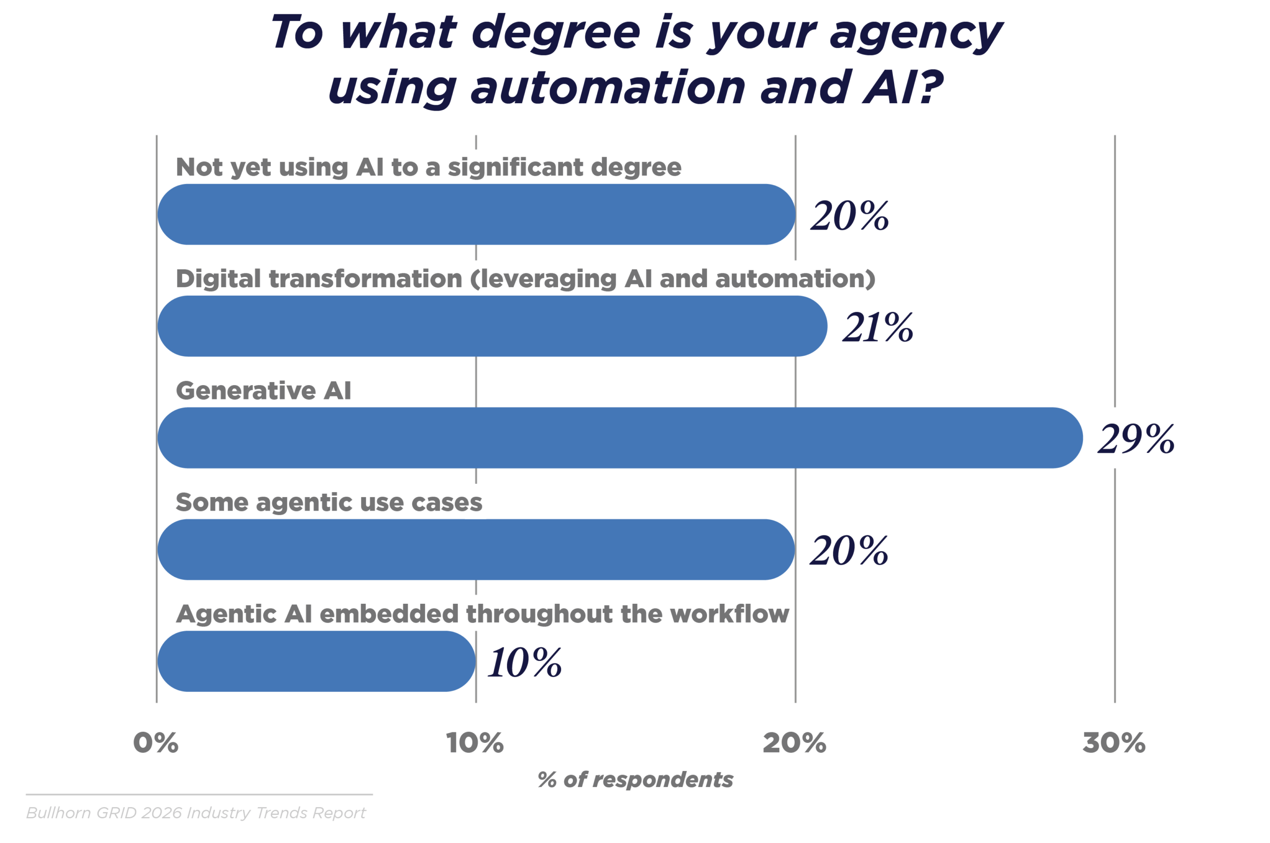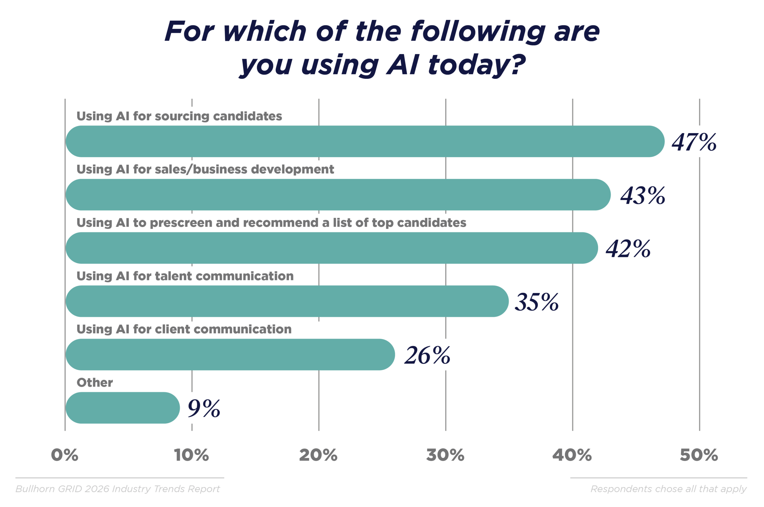 In spite of the clear financial and operational benefits, many firms still have not fully embraced automation and AI across their platforms. Only 10% of firms report having AI embedded throughout their workflow. 2026 will likely be the year that sees AI in recruiting move from early adoption to full integration.