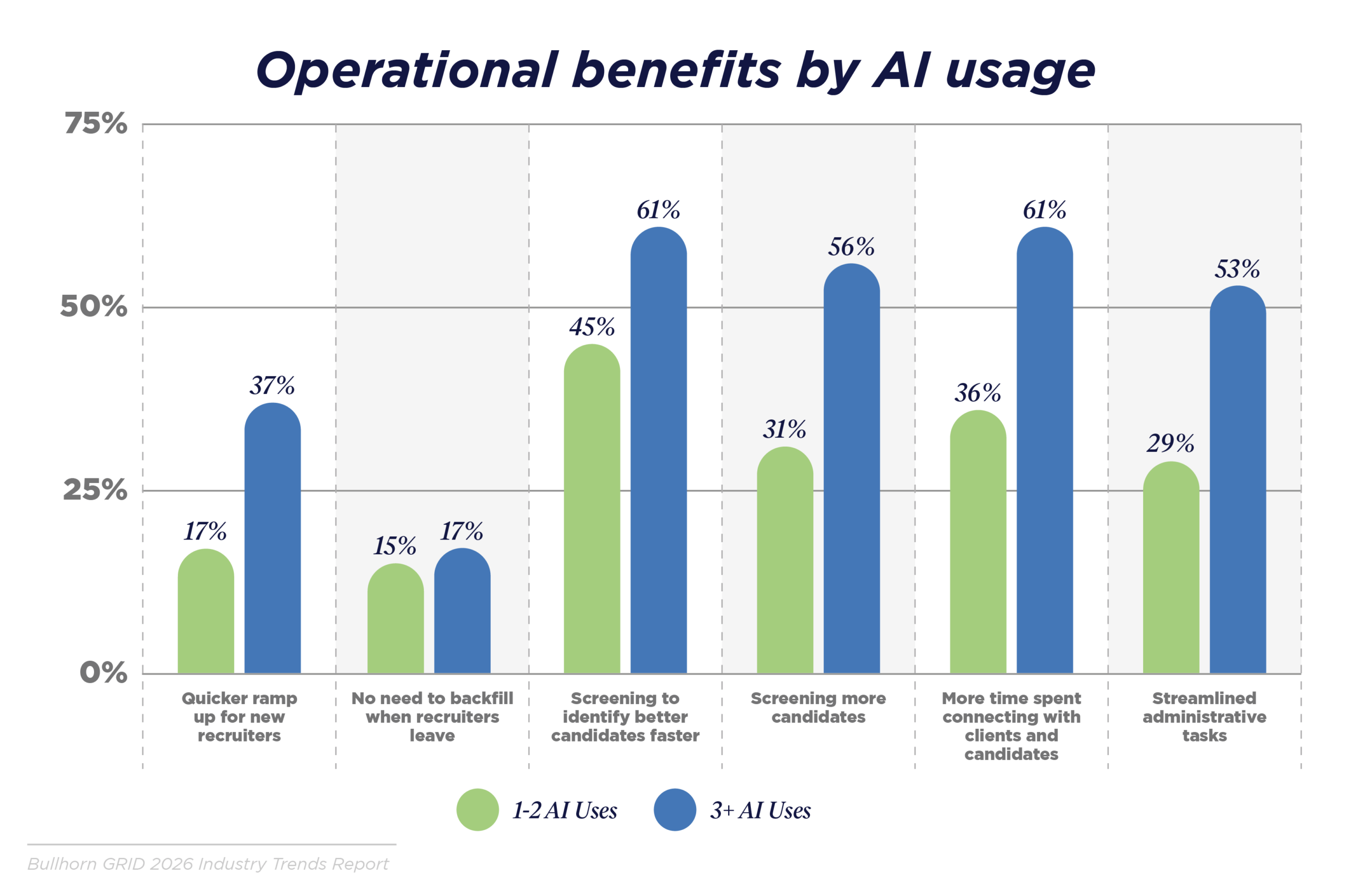 ⅓ note that AI is helping them find more time to connect with clients and candidates, and they rate that as the number one benefit they experience for AI, keeping that human connection that is so crucial for a recruiter’s job satisfaction.
