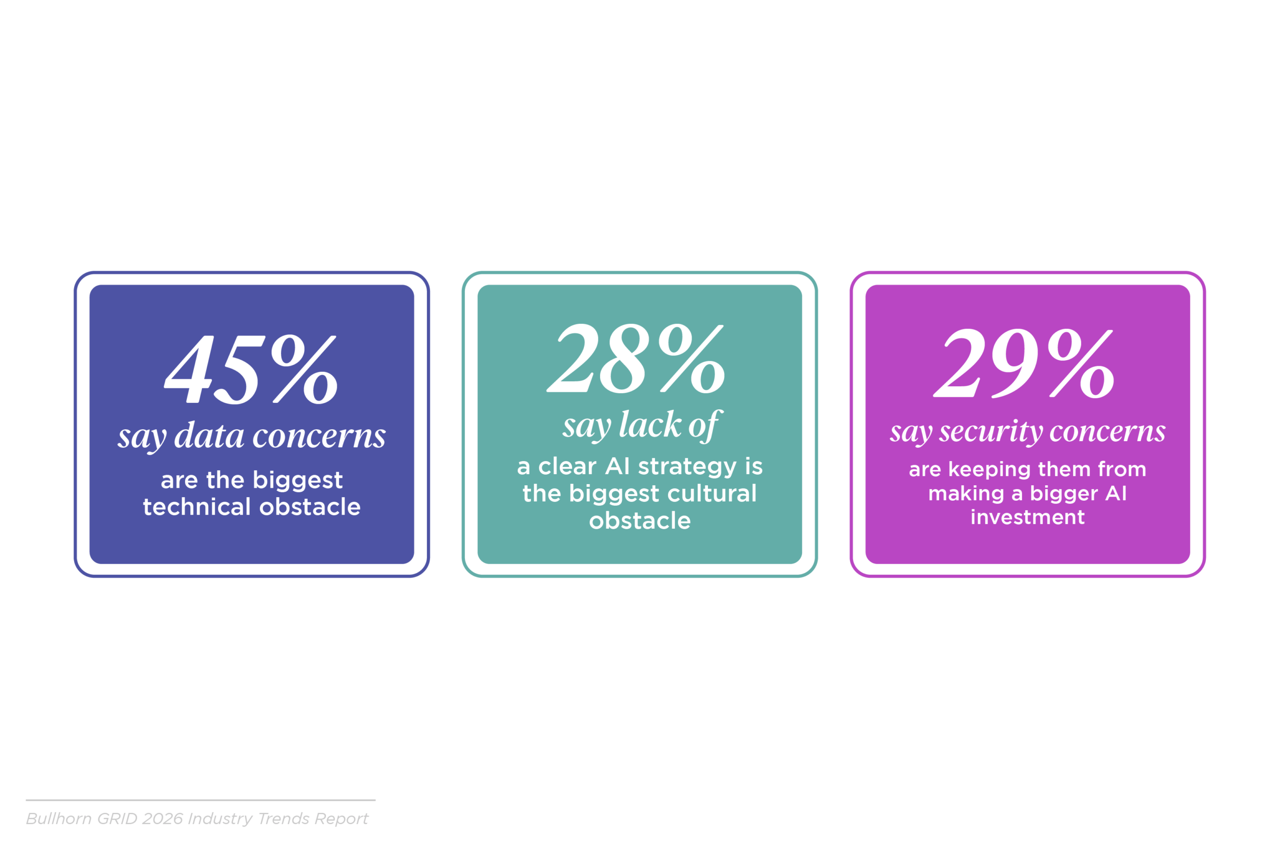 Most leaders (71%) feel ready to lead their firms through AI transformation, but when we dig deeper into the remaining obstacles that stand in the way of full adoption, there are some common themes. Data quality and security are challenges many firms have not quite been able to overcome. And 20% say they lack a clear implementation plan. These concerns are consistent for both leaders and recruiters alike. Leaders also report that they are working hard to help recruiters see and feel the benefits of AI in their work. One firm shared that they have created an intentionally diverse group of “AI ambassadors” to make sure the AI wins are relatable across all areas of the organization.