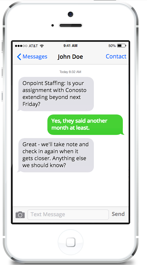 De oplossing? Chatbots die automatisch kandidaten en hiring managers benaderen met berichten om de einddatum en andere relevante informatie vast te stellen. Gewapend met correcte informatie van de chatbot kan de recruiter opvolgen met de kandidaat. Dit is een voorbeeld van een vroege mock-up van dat proces: