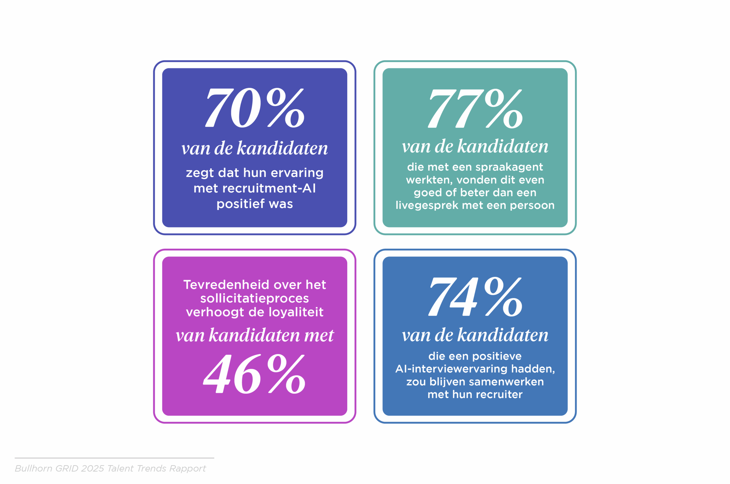 De resultaten zijn duidelijk: AI heeft nu al een positieve invloed op de loyaliteit van kandidaten. 85% van de kandidaten die een positieve AI-ervaring hadden, zou blijven samenwerken met hun recruitmentbureau. Ter vergelijking: bij de rest van de talentpool is dat 71%. Dit doorbreekt de nog steeds veelgehoorde zorg dat AI kandidaten zou afschrikken of het gevoel zou geven dat ze te weinig persoonlijke aandacht krijgen. Integendeel: kandidaten waarderen juist wat AI toevoegt.