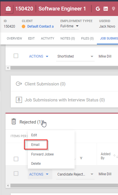 • Emails to Rejected Candidates: You can now send emails to Candidates from the ‘Rejected’ section of the Submission Tab on records, enabling you to make the most of your candidate relationships even if the candidate was rejected from a particular role.