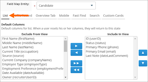 To change your default columns, go to Admin > View Layout and choose the entity you want to set the default for, like Candidates. On the List tab, the first set of boxes you see will be for Default Columns.