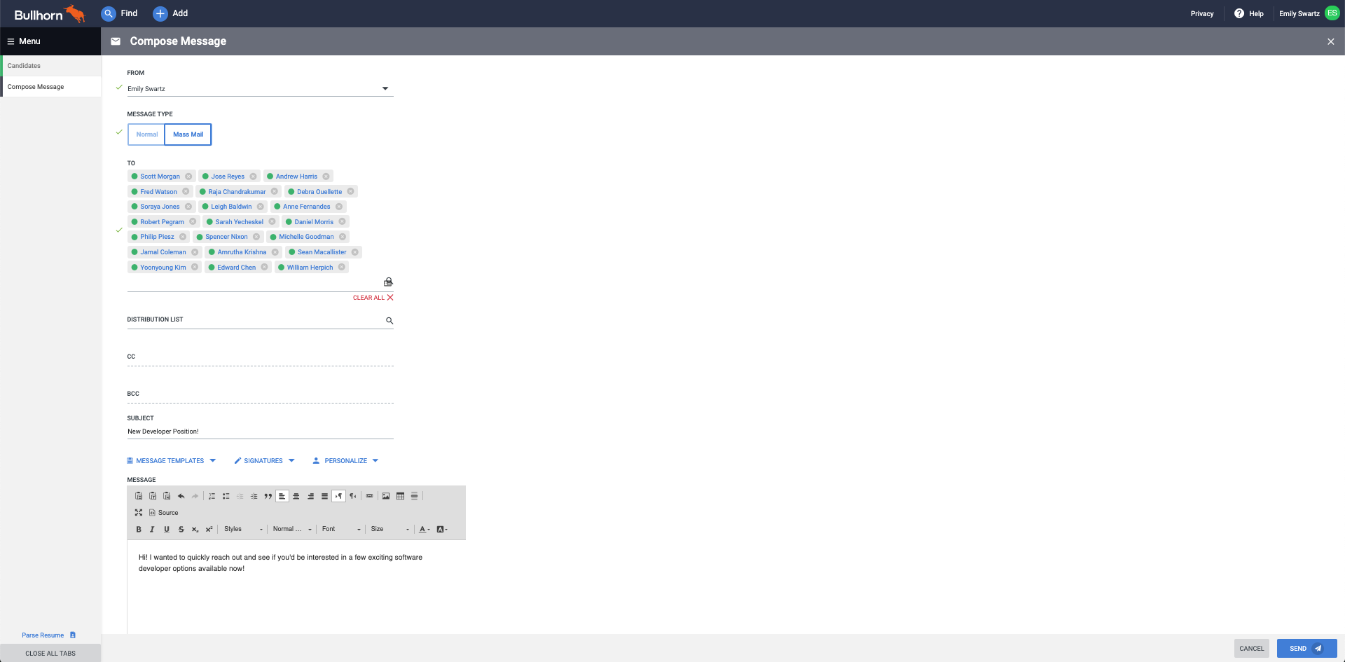 From the tearsheet or list, you can select the candidates you wish to reach out to and use the bulk action menu to draft an email or SMS message. There are formatting options available to ensure your email looks professional and options to CC or BCC any additional individuals – such as other members of your team.