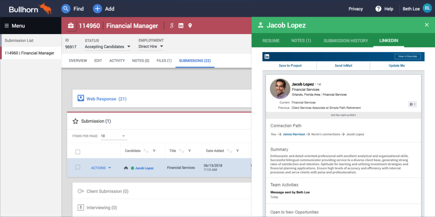With Bullhorn’s LinkedIn integration, you can search for candidates on LinkedIn as you normally would and then utilise the integration to reach out to qualified individuals about open roles. With the integration, you’re able to see which candidates already exist within Bullhorn and can see additional details from their Bullhorn candidate record while you’re still on LinkedIn – no more switching between windows.
