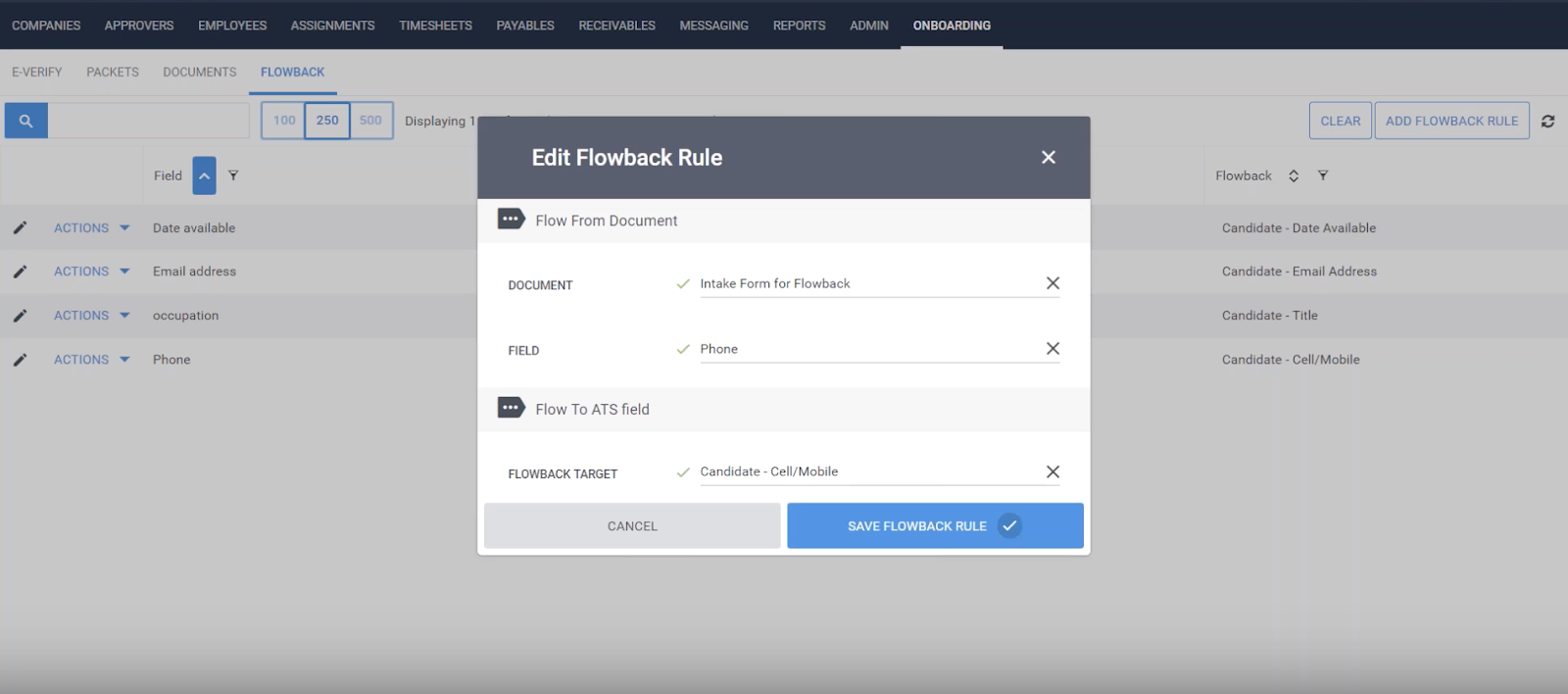 The field flowback functionality added this year allows for data to automatically move from Onboarding documents to the ATS, saving valuable time and eliminating the potential for errors. Field flowback also ensures your candidate records in the ATS will match the latest information your candidates provide on their onboarding forms, so you can be sure that your database is always up-to-date.