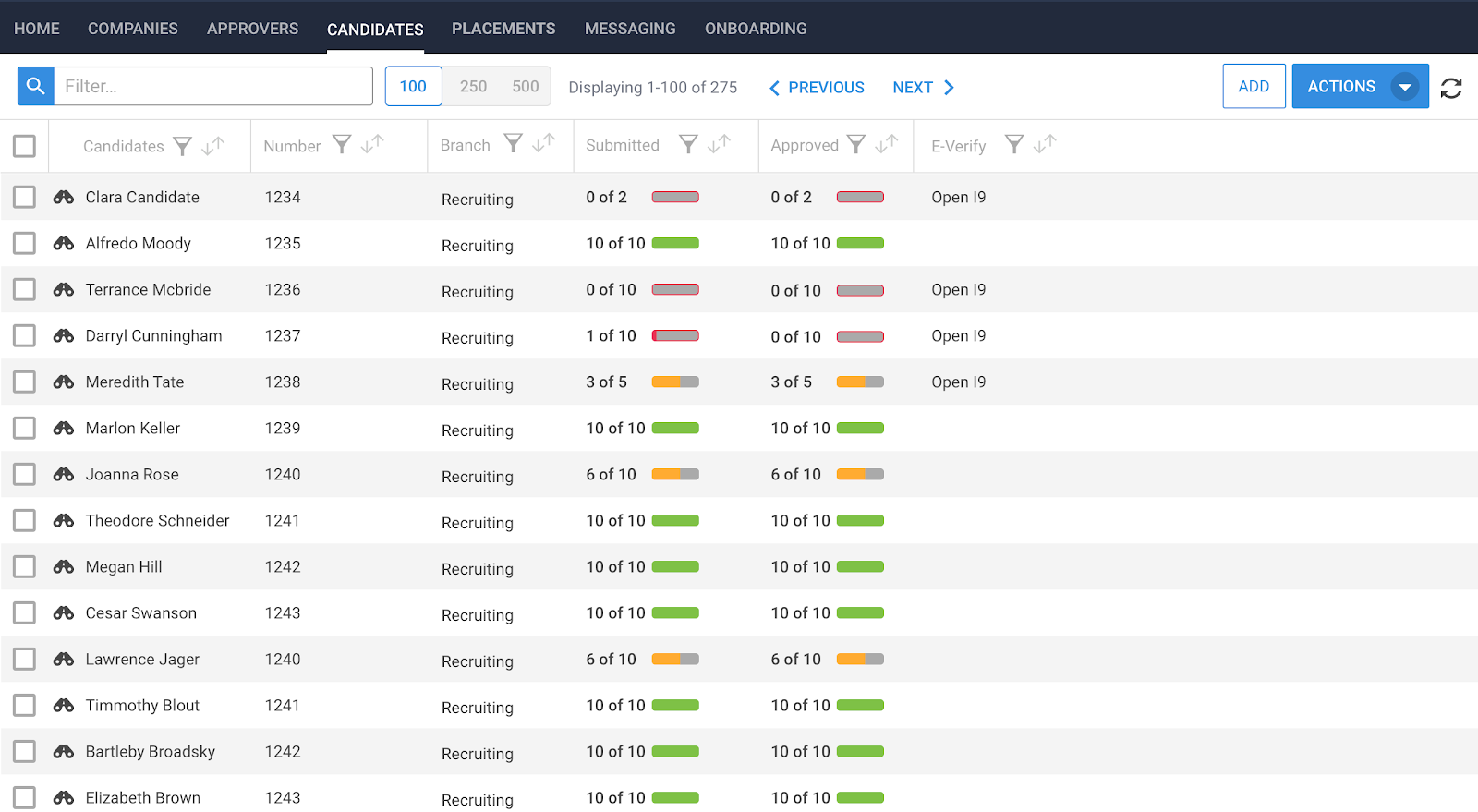 With the release of the new version of Bullhorn Onboarding, we added a new list view that helps users easily see where all of the candidates in the process fall within the onboarding workflow. You can quickly access important information about each of your candidates, including information from the applicant tracking system (ATS), right in the list view using the binocular view, reducing the need to switch between windows.