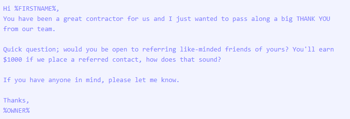 A players know A players, or so the saying goes. Capture more value from your current ‘top talent’ by driving referrals. You can base a referral email simply on assignment end date or go one step further by using a candidate score to find your most engaged candidates.