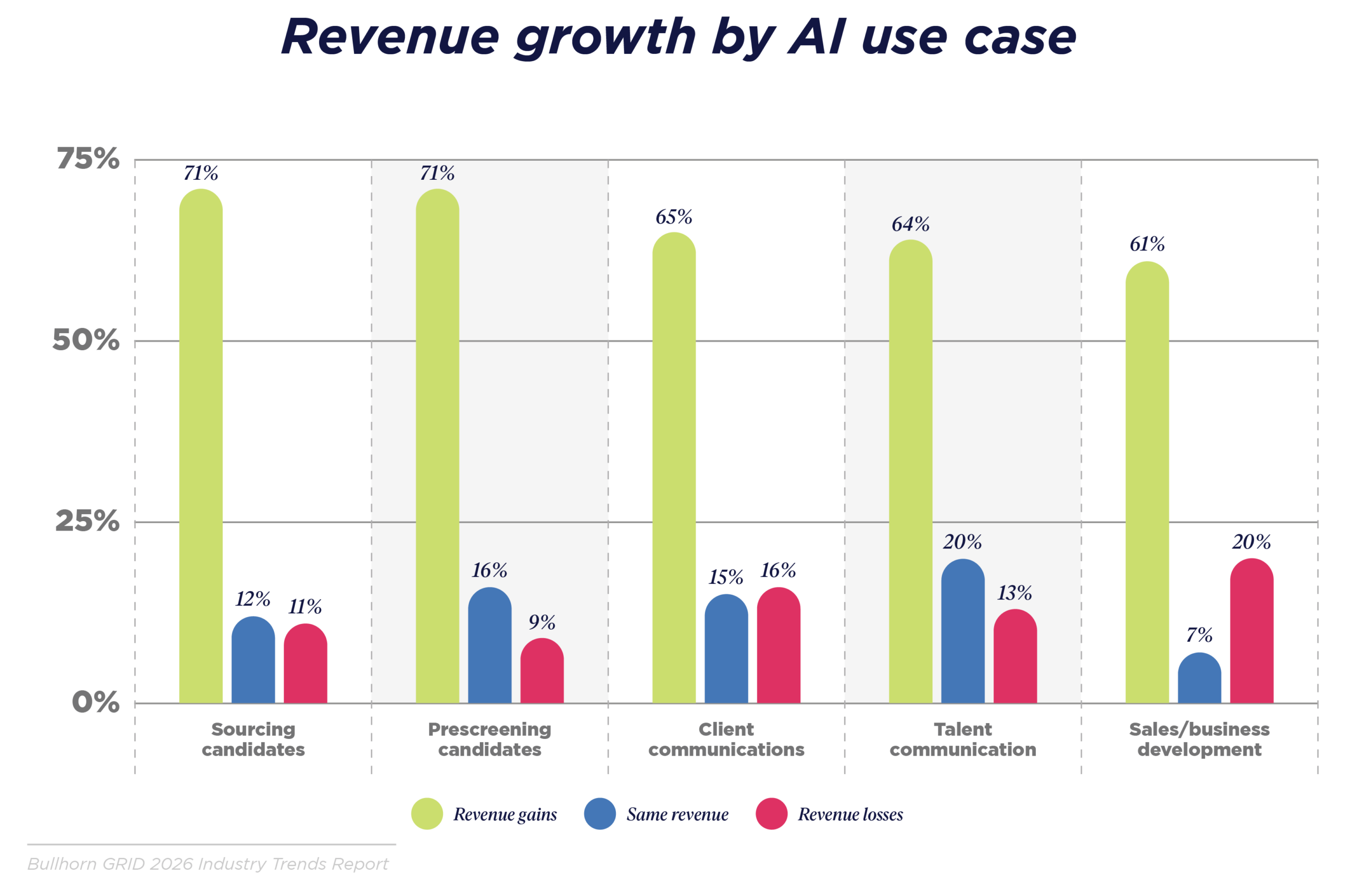 It is not enough to simply have adopted AI; it matters that agencies are using it in meaningful ways that yield tangible benefits. Agencies that are seeing the impact of AI on candidate screening and quicker recruiter ramp-up are reaping the financial benefits, making them significantly more likely to have increased revenue in 2025.