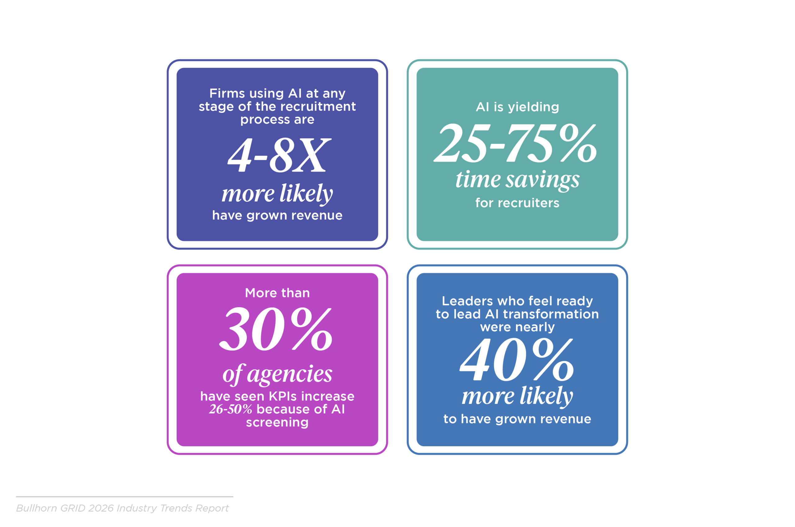 Half or fewer agencies are using AI for any individual recruitment function. And only 7% of agencies reported having agentic AI embedded throughout the workflow. That leaves a lot of room for growth and even greater revenue and KPI impact in coming years.